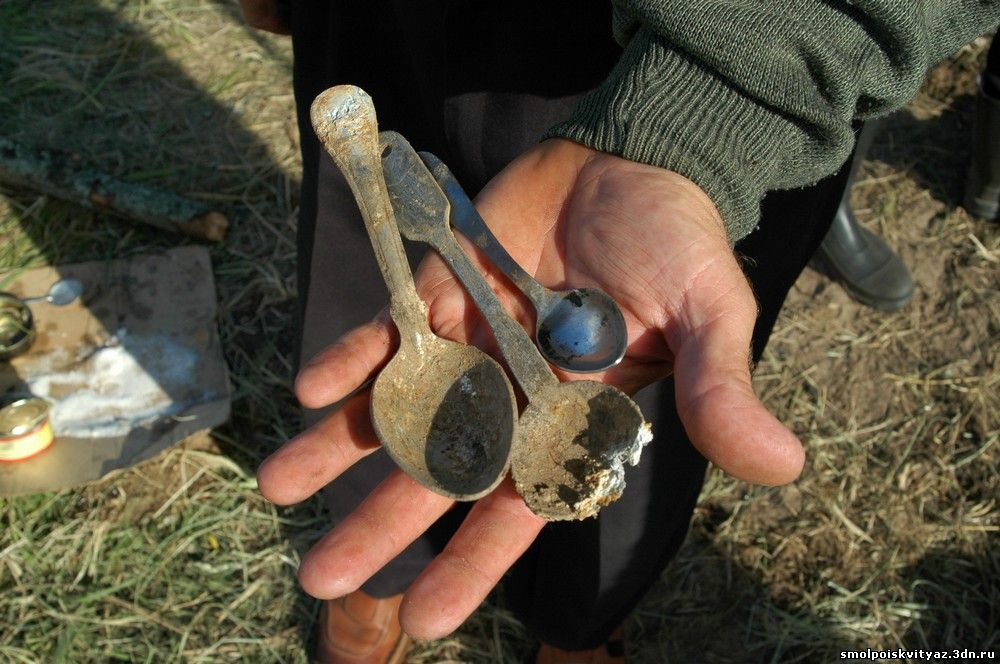 В процессе работы были обнаружены личные вещи погибших солдат,было найдено 6 медальонов,четыре ложки,одна из них подписана фамилией "Макаров",остатки боеприпасов,два штык-ножа от СВТ,пряжка от офицерского ремня,свисток,монеты,одна из них польская.Была еще одна необычная находка,поднимая бойца я обнаружил у него в кармане маленький свёрточек из упаковки индивидуального медицинского пакета,когда я развернул свёрточек в нём оказались несколько советских монет и серебряное колечко.