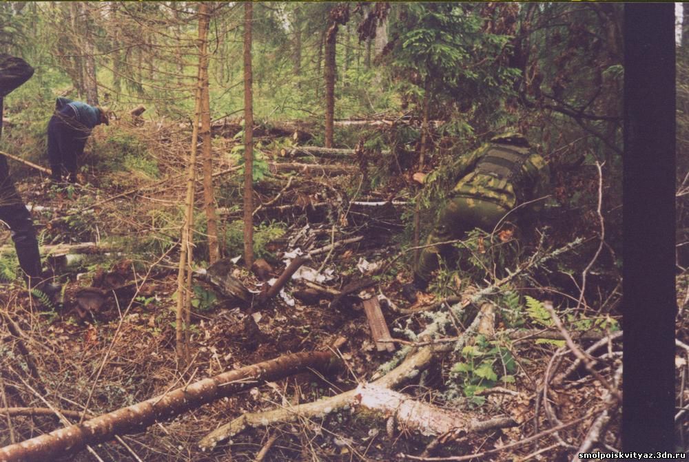 Место падения самолёта представляло собой две расположенные рядом,"перекрывающие" друг друга воронки,вокруг воронок валялись части самолёта которые не ушли в землю,а видимо при ударе отлетели в стороны.