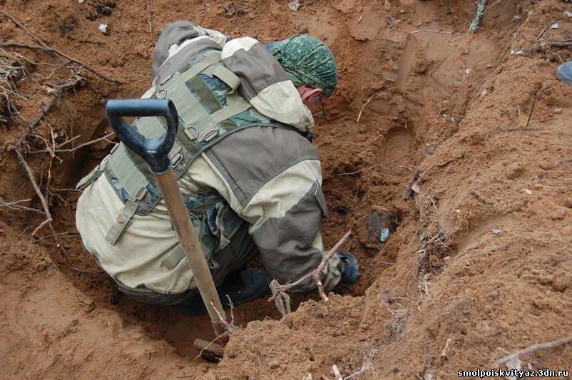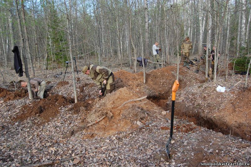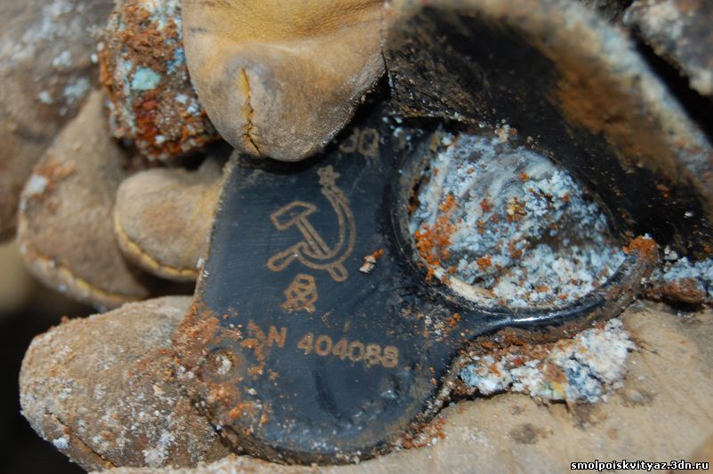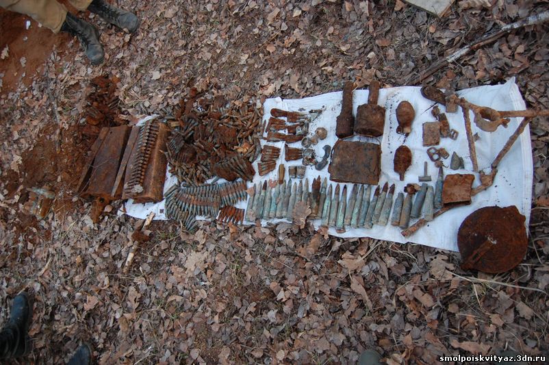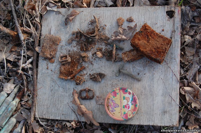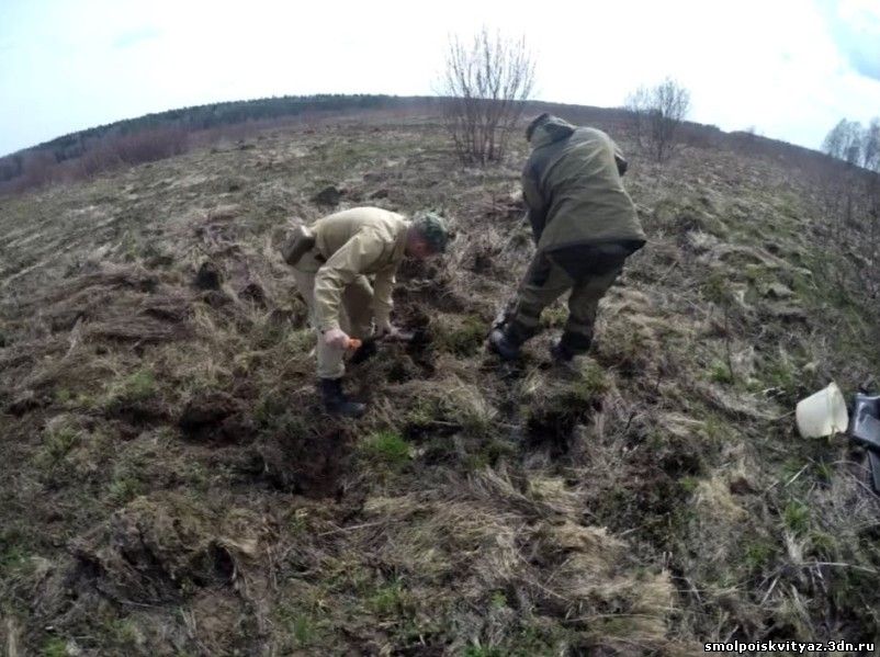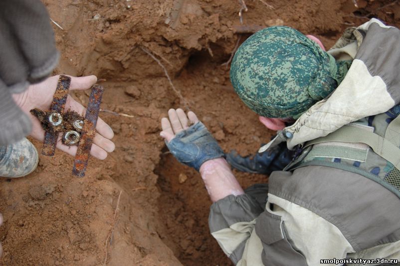 На следующий день мы продолжили свою работу ,но уже в другом месте. Было решено провести разведку в районе высоты 212.5 находящейся севернее д. Гряда, согласно полученной информации из переведённых немецких документов, высота была постоянно занята, группой бойцов партизанского полка м-ра Жабо, эта высота находилась на пути наступления немецких частей в конце мая 1942г на д. Гряду. Прибыв на место, мы обнаружили на высоте позиции в виде узла круговой обороны с окопами и укрытиями. Мы приступили к поиску, Обследовали южную, центральную часть узла обороны но ничего не обнаружили, но когда приступили к обследованию северной части позиции, сразу пошли находки, в самом крайнем рукаве окопа выходившем вперёд на несколько метров металлоискатель просто не умолкал, мы взяли лопаты и просто стали полностью поднимать этот окоп и сразу пошли находки, остатки сошек , остатки боеприпасов к отечественному оружию, к немецкому пулемёту, и среди всего этого мы нашли нашего погибшего солдата, скорее всего он был из расчёта пулемёта или ПТР , судя по найденным у него вещам он был военнослужащим РККА, при нём был котелок, бритвенный станок, остатки армейского брючного ремня и капсула медальона, но к сожалению она оказалась пуста. Так как народа у нас было много то работа была распределена по всей протяженности окопов в северной части обороны.