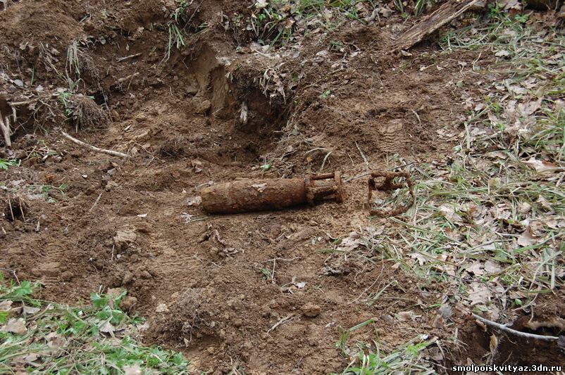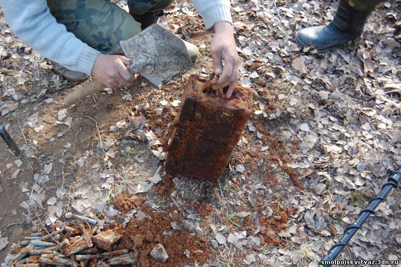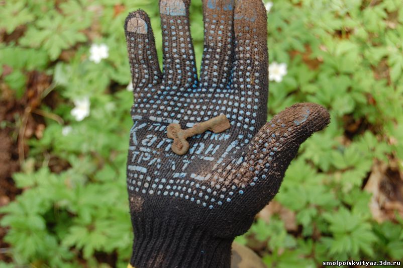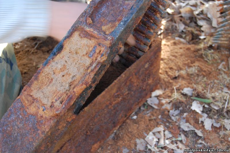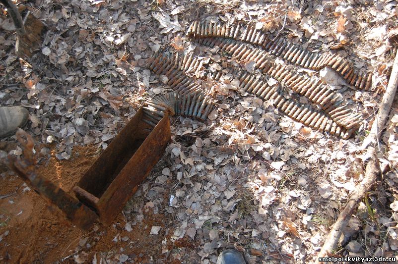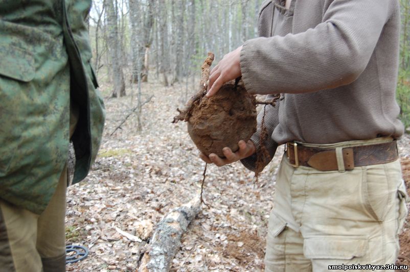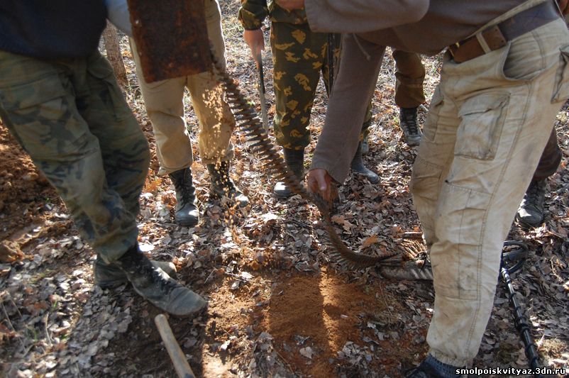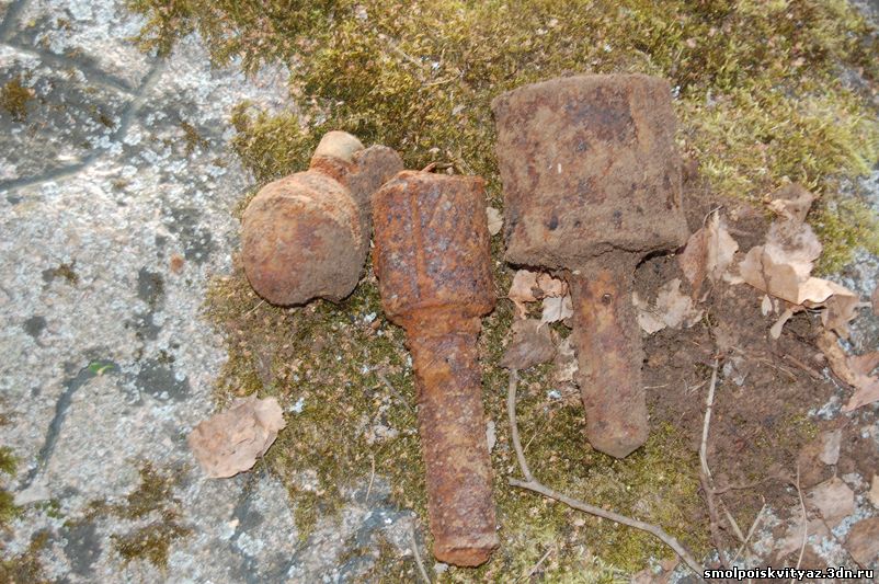 На следующий день мы продолжили свою работу ,но уже в другом месте. Было решено провести разведку в районе высоты 212.5 находящейся севернее д. Гряда, согласно полученной информации из переведённых немецких документов, высота была постоянно занята, группой бойцов партизанского полка м-ра Жабо, эта высота находилась на пути наступления немецких частей в конце мая 1942г на д. Гряду. Прибыв на место, мы обнаружили на высоте позиции в виде узла круговой обороны с окопами и укрытиями. Мы приступили к поиску, Обследовали южную, центральную часть узла обороны но ничего не обнаружили, но когда приступили к обследованию северной части позиции, сразу пошли находки, в самом крайнем рукаве окопа выходившем вперёд на несколько метров металлоискатель просто не умолкал, мы взяли лопаты и просто стали полностью поднимать этот окоп и сразу пошли находки, остатки сошек , остатки боеприпасов к отечественному оружию, к немецкому пулемёту, и среди всего этого мы нашли нашего погибшего солдата, скорее всего он был из расчёта пулемёта или ПТР , судя по найденным у него вещам он был военнослужащим РККА, при нём был котелок, бритвенный станок, остатки армейского брючного ремня и капсула медальона, но к сожалению она оказалась пуста. Так как народа у нас было много то работа была распределена по всей протяженности окопов в северной части обороны.
