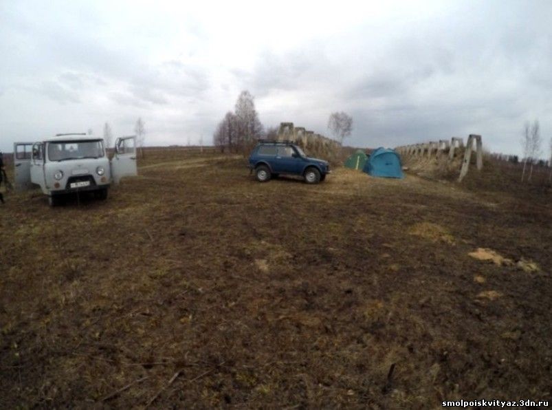 Поисковый сезон 2015 года мы как обычно начали с Вахты памяти в Угранском районе Смоленской области. 24 апреля состоялся выезд, мы прибыв в Угру оформили все установленные для проведения работ документы и убыли разворачивать лагерь. Лагерь мы поставили в известном месте, в д.Богатырь, вернее на месте где располагалась эта деревня, в этой деревне в 1941 году попала в засаду и погибла первая, экспериментальная батарея реактивных миномётов под командованием капитана Флёрова.