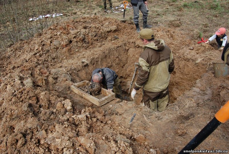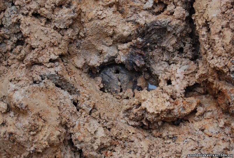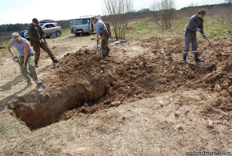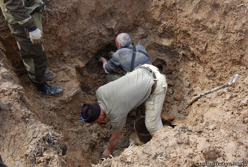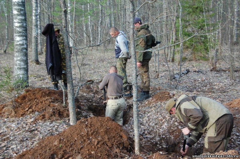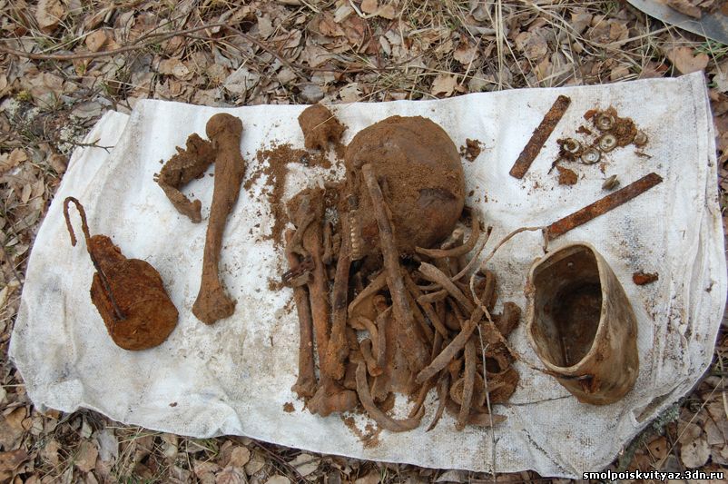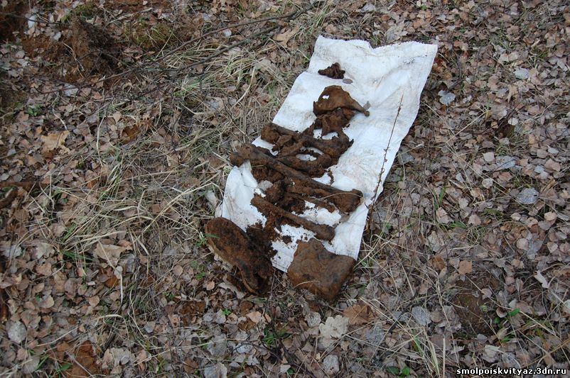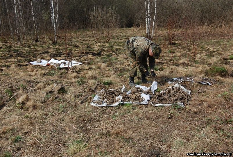 Так в работе прошло несколько дней, пока мы не подняли всё захоронение, В захоронении оказалось 19 погибших бойцов, к сожалению никаких документов или вещей по которым можно было бы установить личности погибших не оказалось. Информация от местных жителей тоже весьма противоречивая, то утверждали что это пленные из пересыльного лагеря, то парашютисты, якобы приземлявшиеся на это поле и погибшие от огня немецкого гарнизона. У нас немного другая версия , согласно документов партизанского полка м-ра Жабо, 6 мая 1942г была проведена разведка боем в районе Деменино и Марфино., по видимому это погибшие при этой разведке боем. Есть ещё один документ в Смоленском Архиве,это стенограмма воспоминаний Кресановой Марфы Семёновны. проживавшей в д. Андрияки (соседней деревни) вот выдержки из стенограммы: "В феврале к нам подбросили человек 300 и тогда повели наступление в трёх направлениях, но из этого ничего не вышло....", ....." 17 февраля 1942г был первый бой когда наши наступали на Ходнево и Деменино и оттуда привозили раненых к нам...." , ..." Когда 17 февраля 42г ходили в наступление, то вместе с партизанами ходили в наступление парашютисты и армия Белова....". Вот на сегодняшний день все версии. По окончании работ мы собрали останки в мешки, сфотографировали все что было обнаружено, убрали на дно раскопа найденные вещи, убрали за собой территорию нашего рабочего лагеря и засыпали раскоп, и убыли в базовый лагерь, по пути заехали к главе поселения и ознакомили её с результатами нашей работы.
