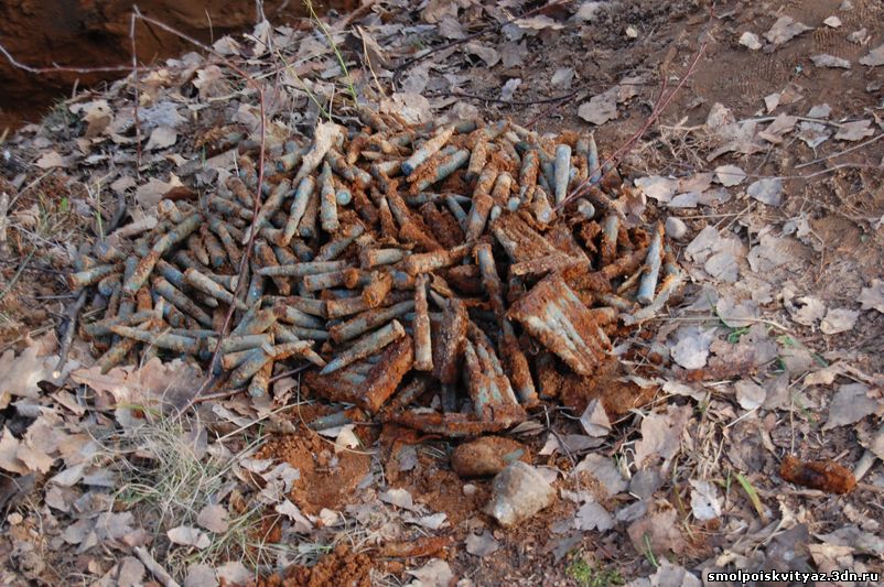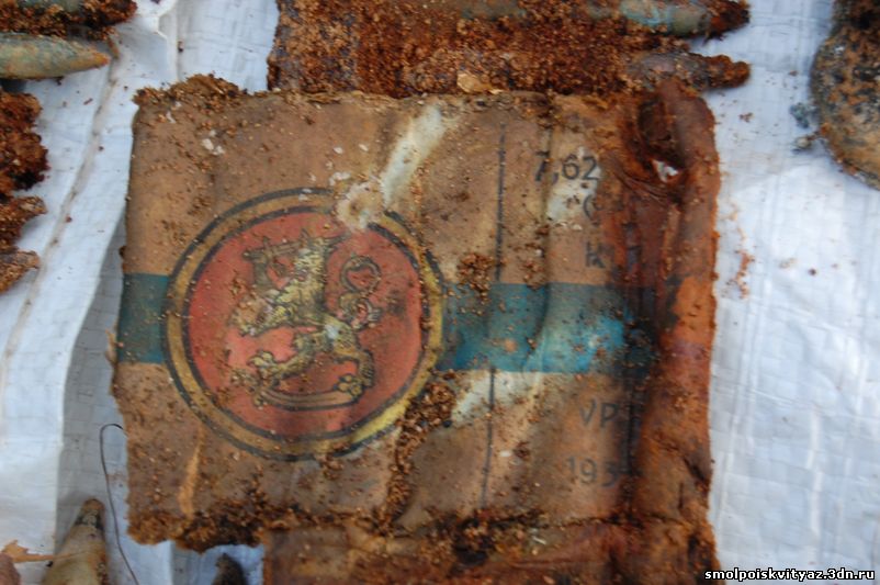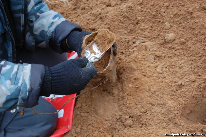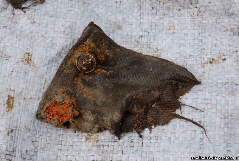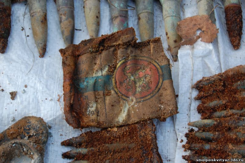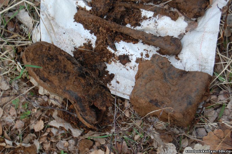 В процессе подъёма останков нам начали попадаться и находки, в основном это были элементы военной формы остатки гимнастёрок, шинели, свитера, перед захоронением погибшие были раздеты, отсутствовала обувь, и верхняя одежда, отсутствовали головные уборы, снаряжение, у некоторых в карманах попадались винтовочные патроны. Но судя по образцу сохранившейся формы погибшие относятся к периоду 1941-1942 г.