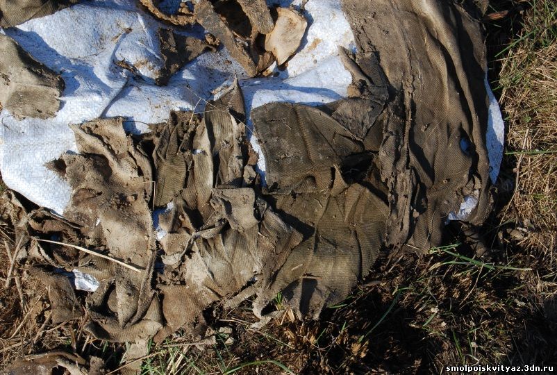 На следующий день мы продолжили работу на этом же месте, количество находок увеличивалось, нашли мы останки ещё одного бойца, он лежал в 15-20 метрах позади первого поднятого бойца, этот боец был при котелке, остатках боеприпасов при нем были найдены остатки парашютного ранца запасного парашюта, или какой-то сумки или рюкзака с использованием элементов деталей применяемых в производстве парашютов.