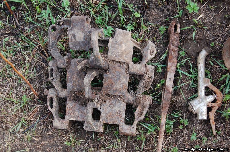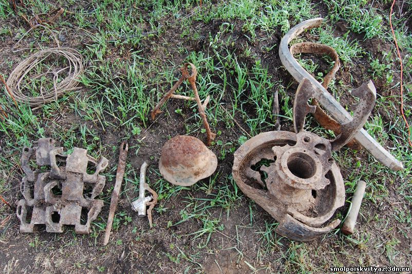 Судя по нашим находкам противник наступал с севера и мы решили после окончания работ на позициях, проверить подходы к высоте по которым двигался противник и вот какие напрашиваются выводы, Противник наступал с севера на высоту, используя танк или несколько танков, один из танков был повреждён попаданием снаряда в передний каток , в районе высоты располагалась огневая позиция артиллерии, но мы её не обнаружили (пока), кроме того была повреждена ещё какая-то техника, к этим выводам нас подвели наши находки. Нами был найден повреждённый снарядом каток танка и поврежденный участок гусеницы, их видимо после ремонта оставил экипаж танка, вот эти части на снимке. Там же недалеко были найдены и другие предметы с этих снимков.