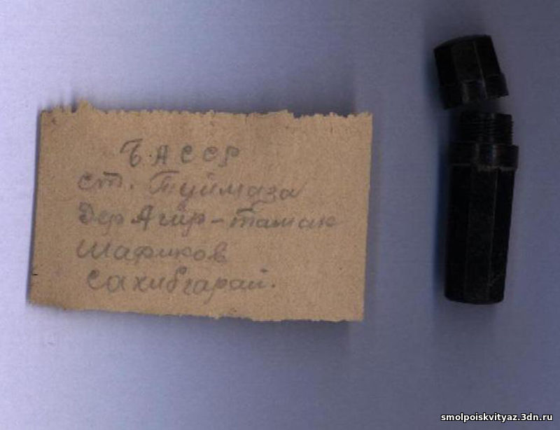 Прибыв в лагерь приступили к вскрытию пенала. Записка из пенала извлеклась без особого труда,, и мы приступили к её прочтению. И вот что там было написано: БАССР ст .ТУЙМАЗА, дер. АГИР-ТАМАК , ШАФИКОВ САХИБГАРАЙ.